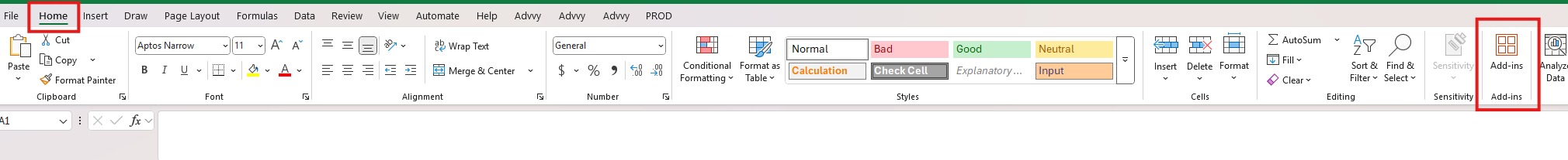 Once installed, the Advvy Add-in tab will appear in Excel’s ribbon.
