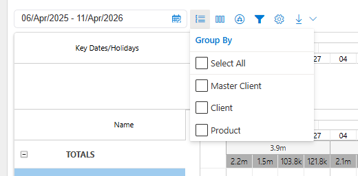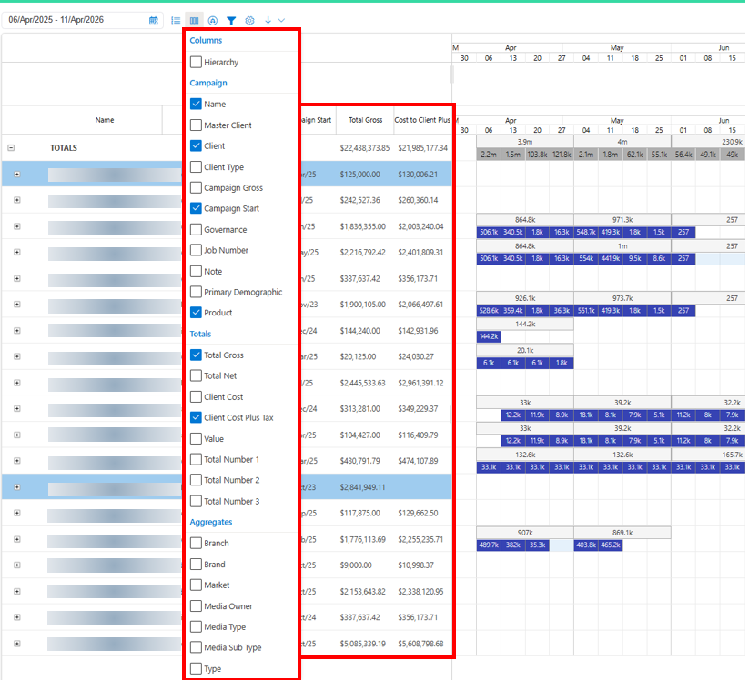 Gantt Text (Monthly / Weekly): Choose which aggregate values appear in the timeline (e.g. Gross, Net, TARPs)