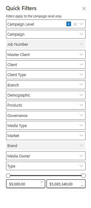 This means available filter values reflect only campaigns included in the date window, improving performance but sometimes producing narrower filter lists.
