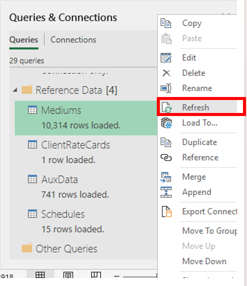 Before refreshing queries, ensure Reference and Campaign Data has been downloaded: